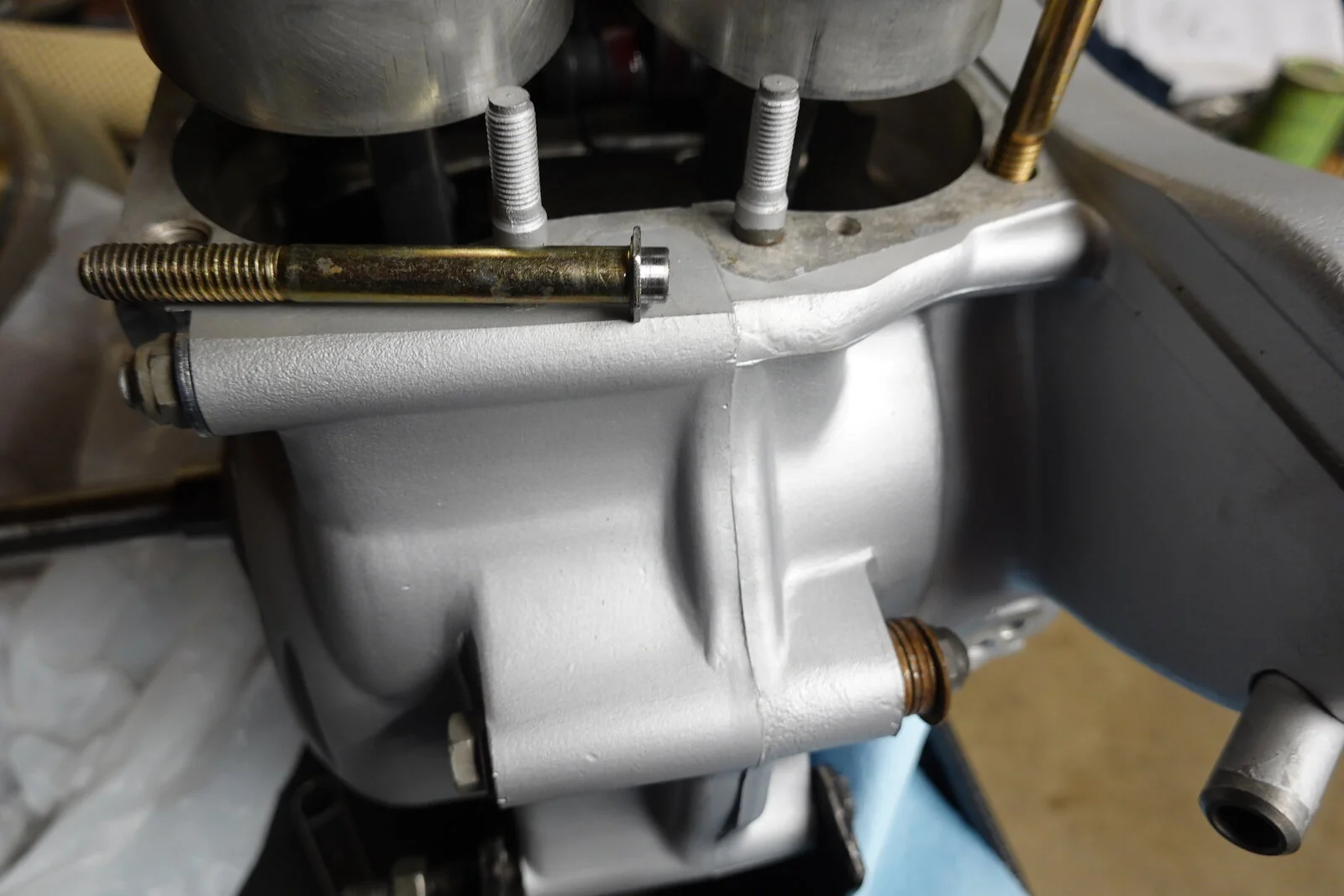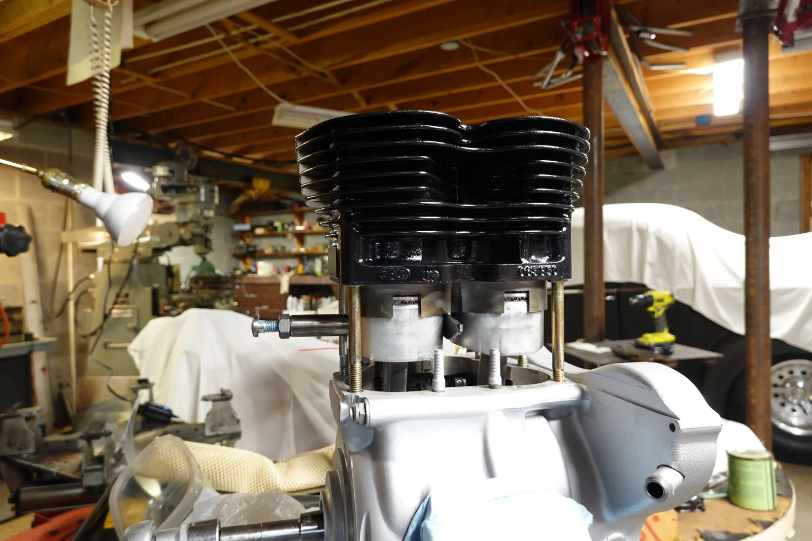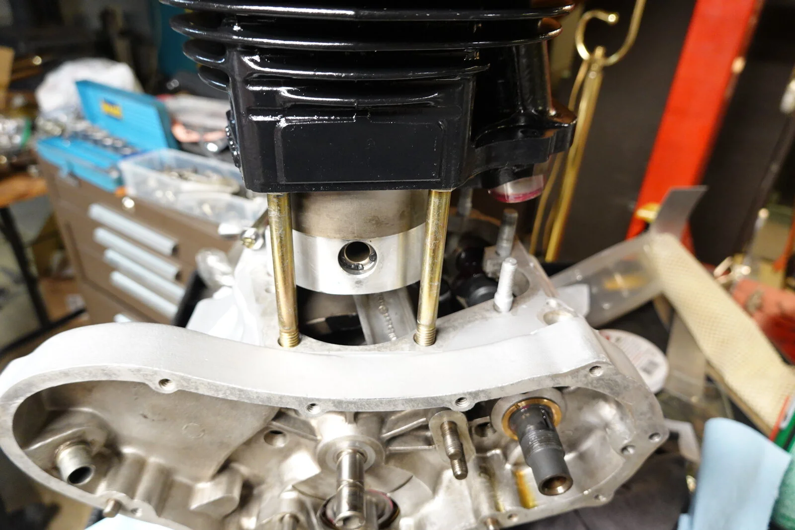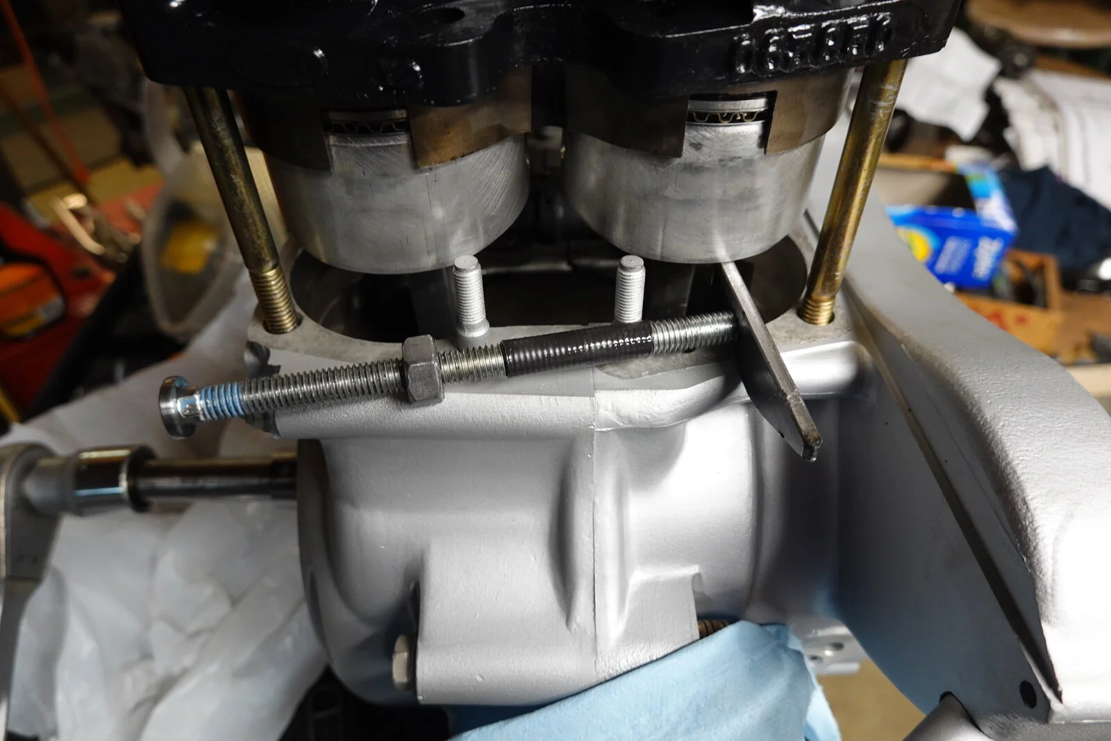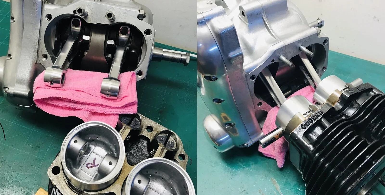 Whenever I replace pistons and assemble the cylinders, I feel like it's a little out of control. Probably the most popular way to assemble is to put pistons on the connecting rods, then use a ring compressors to slide the two pistons into the cylinders at once. This is where it seems a little shaky, possibly marking rods or piston or a broken ring. Today I put pistons into the cylinder first. Used 3/8 bolts to hold the barrel inplace. Then pulled wrist pins into place with protected all thread. The bolts held the cylinders in place and allowed you to move the connecting rods around to feel the proper alignment. No rush fearing your gasket sealer will hardened before you get it together. I am not using a base gasket. May not be the best but works for me!