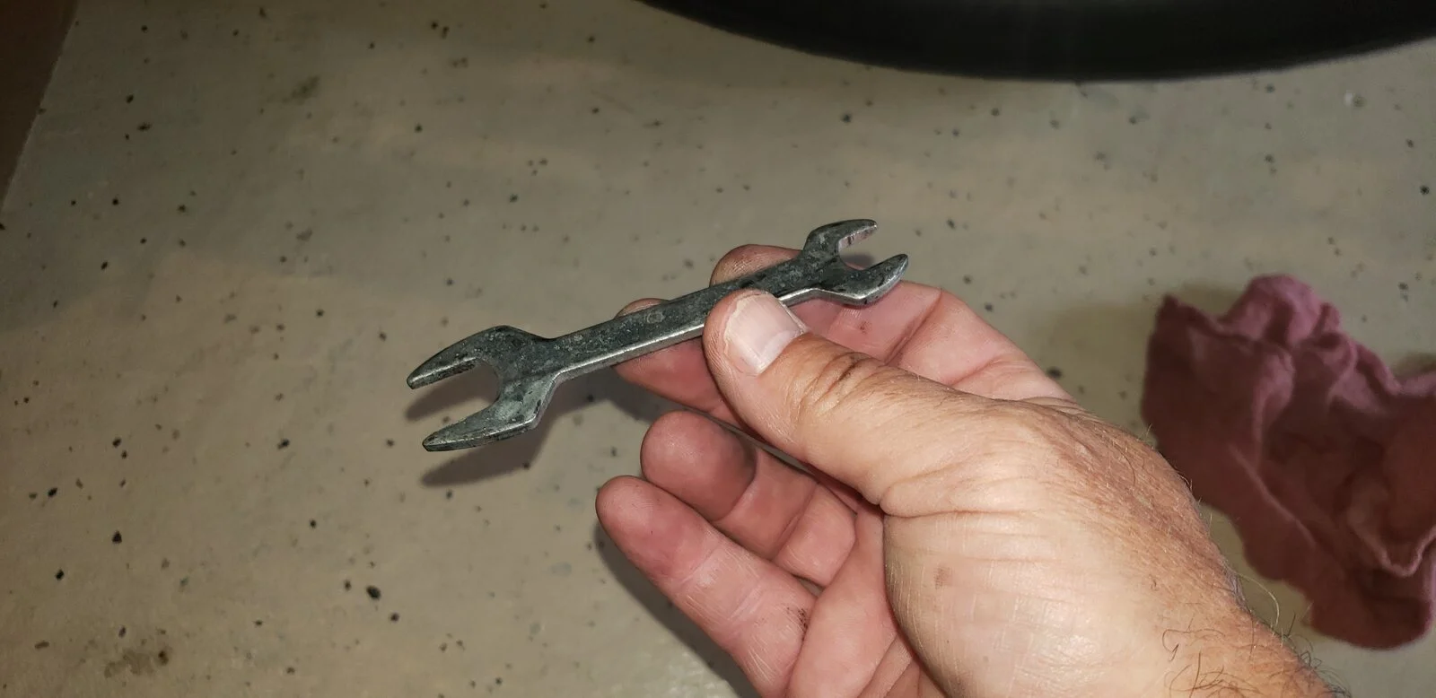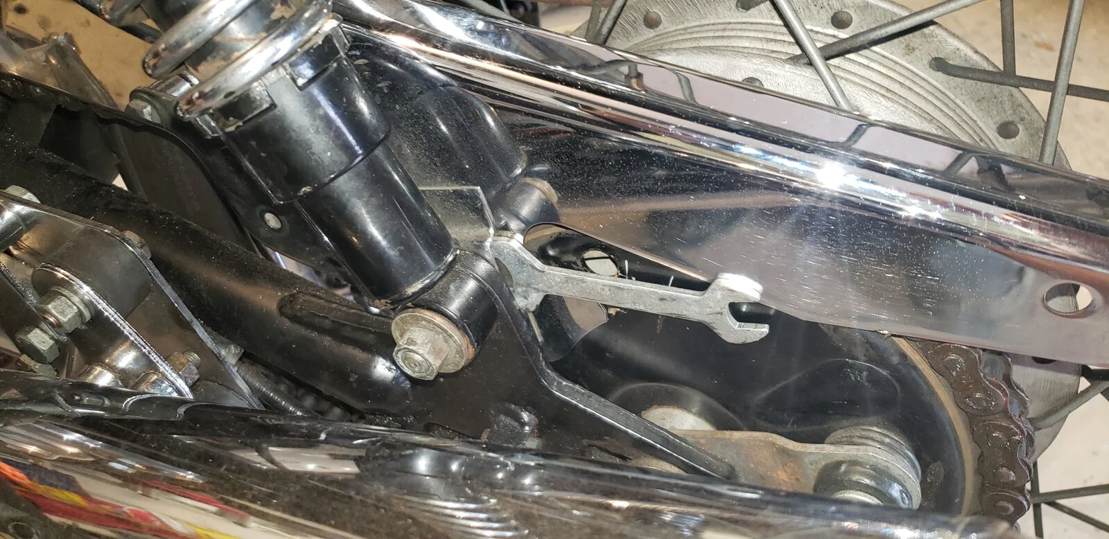 Great idea. The nice thing about using a cheap, stamped wrench like that is you don't care if you have to modify the wrench by grinding the outside [circumference] thinner to get it to fit in the available space. FYI, those thin wrenches are commonly referred to as "tappet wrenches" even here in the USA. Their original use was to adjust valve clearance on old flat head engines, hence the name.I have a collection of cheap tools that sometimes come with self assembly items. I finally found a use for one of them. Cheap 9/16" stamped spanner. Perfect for the bolt head that holds the chain guard to the shock mount.