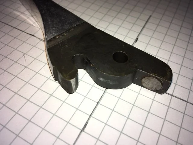And, with all respect to Don (madass 140) who knows a lot more than I do about this, I suggest that if you need to make more room, you file back the pivot stop area of the lever, seen in this picture with a round "pad", rather than filing the heel which contacts the piston end. The heel is carefully shaped and has to roll across the end of the piston without falling off.