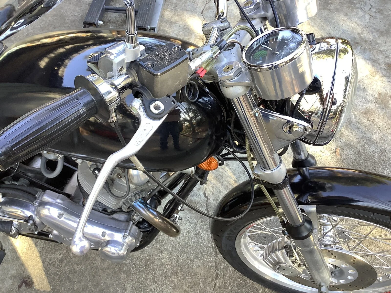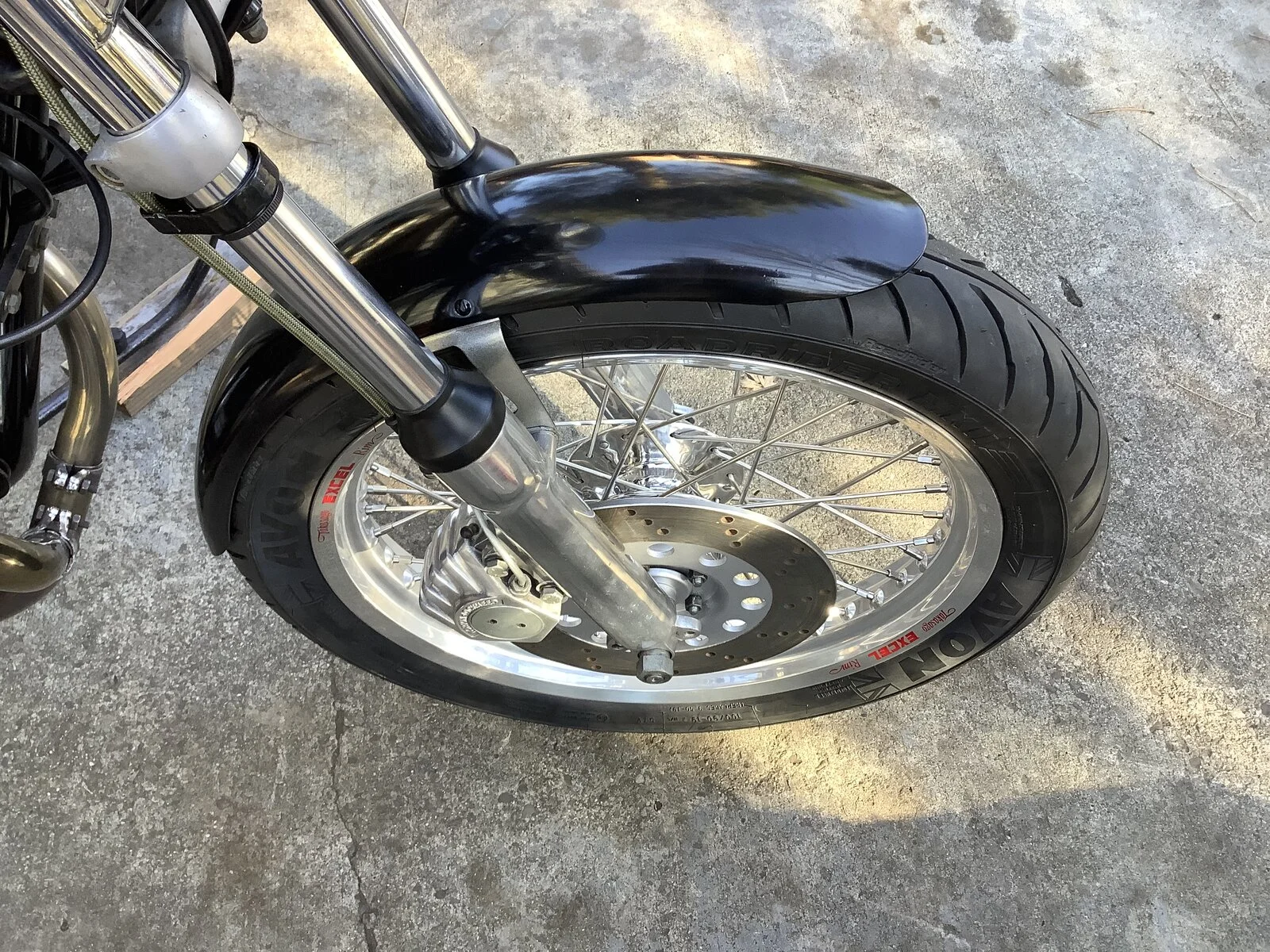 Finally got the tires (Avon RR, 100/90-19) mounted on the custom wheels I had assembled at Buchanan’s that have been sitting around for awhile. 2.5“x19” Excel rims, front and rear, stainless spokes. I had CNW polish the front hub and mod it to accept upgraded bearings. Got Don Pender’s rear hub with the upgraded cush drive, one piece stainless axle, and polished alloy brake ass’y.