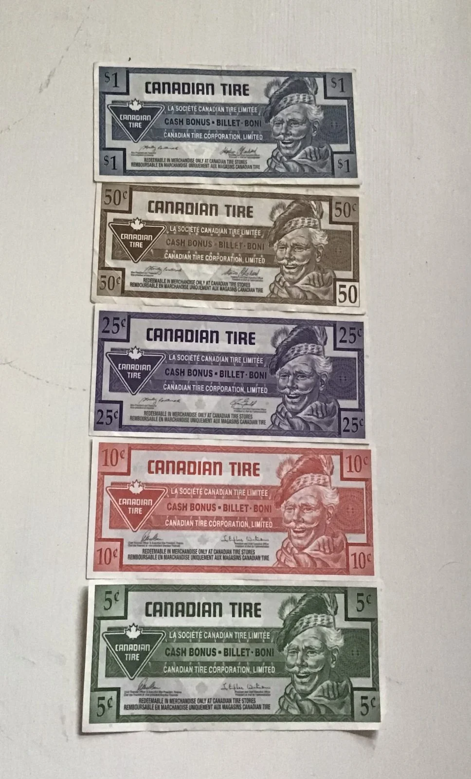 For those of you that have no idea what we're talking about, and are curious here's a photo of the denominations I have. Fellow Canucks will note the coveted and rare $1.00 note!