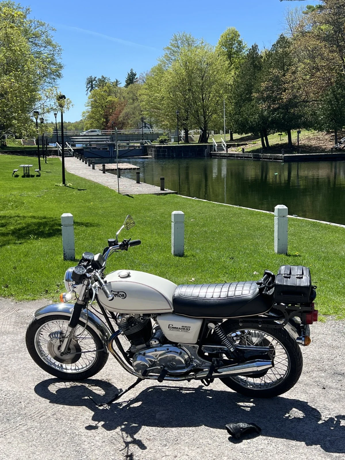 Friday: Left the Commando in the garage due to weekend weather forecast. Rode to Quail MC Gathering on modern Triumph. Four hours of slow, go, stop and lanesplitting around huge trucks. Stayed at motel. Saturday: Got to event at 8:30 AM. Cold and overcast. Rain started around 10 am and did not let up. Left at 1:30 and got back to motel, drenched. Sunday, cold but dry in AM. Rode home with no issues. Got the Norton out and did 11 fun miles.