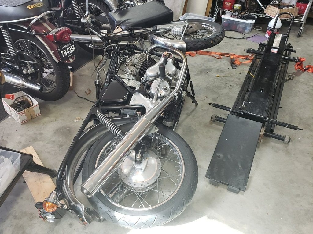 The muffler is OK, the mounts are bent - that's no big deal. The PITA is that I spent about 6 hours restoring the turn signals and taillight bracket and then doing what I consider the hardest Commando job - getting the rear fender, taillight, and turn signals aligned. That's all a mess now. The side-stand took some damage - I'm hoping it the stand and not the mount or frame. It still holds the bike up OK, but it leans a little more than before.