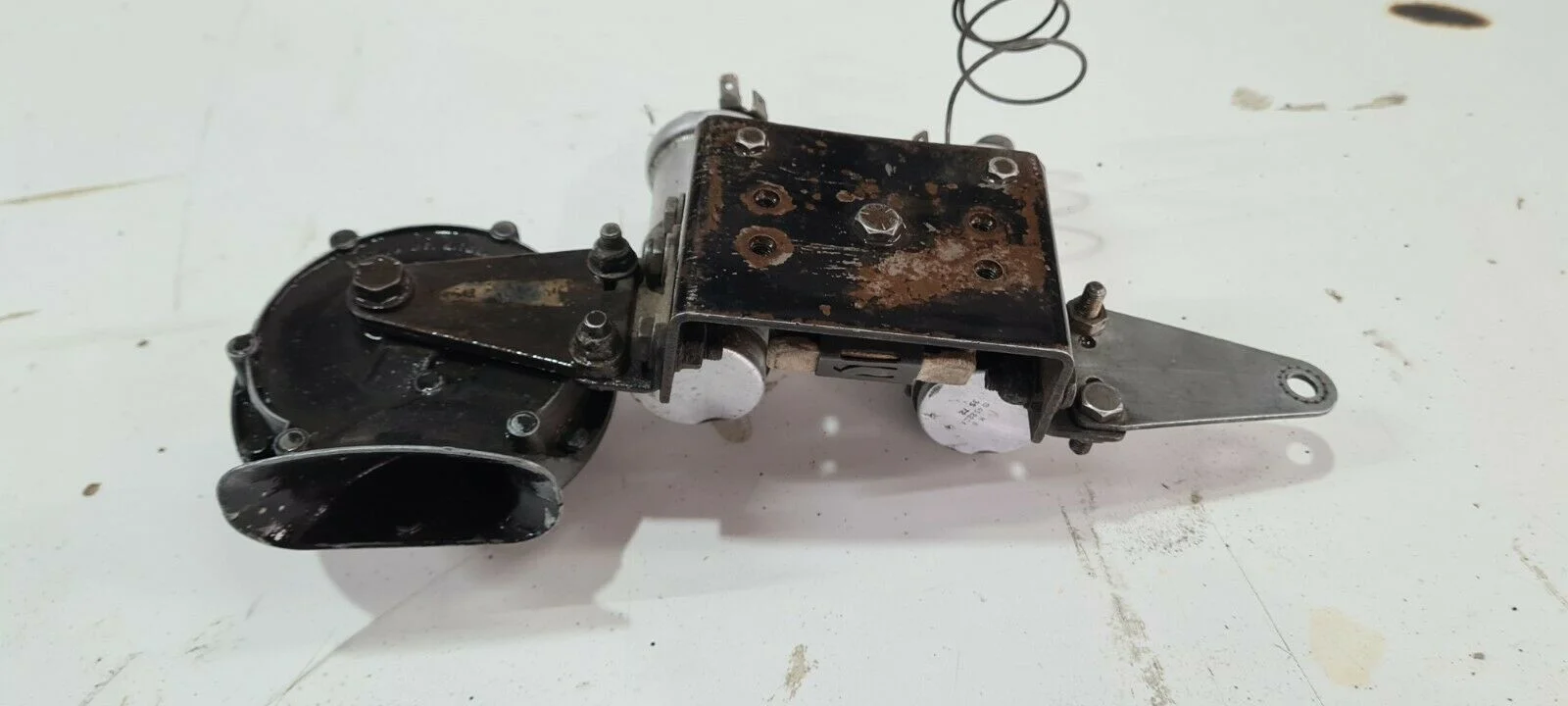 Another item for sale at Fleebay. Coil mounting bracket with two L-brackets, bracket extensions, and twin Lucas 9H windhorns (one horn missing here).