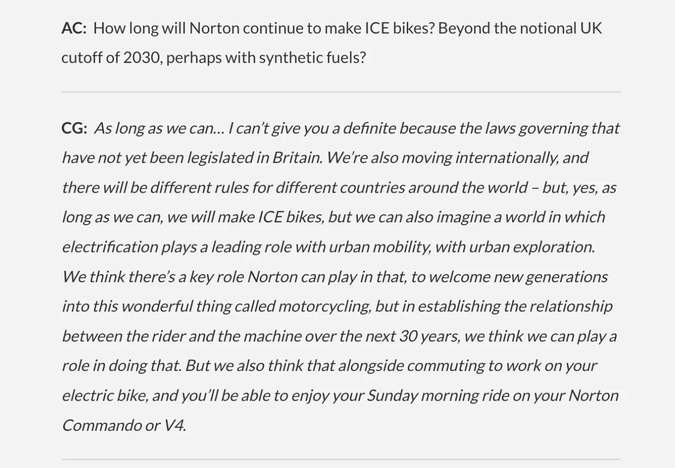 It´s interesting you say this since you were also pointing out that Norton is doing this due to regulation (aka policy coming politics). If you ride a motorcycle and if it´s a Norton, we should be on the same page. People like me are surely not the ones to be pushing the EV nonsense, so how else to describe it? Are you going to be fine with non-riding bureaucrats telling you your days are over? And if the company is using it´s diminishing energy and resources to develop something while not having it´s heart behind it, nothing good can come out (let alone solve the current parts issues, etc). Oh, I forgot that the media are now forever parroting that the ICE/EV discussion is already concluded, and that we just better shut up and deal with it.