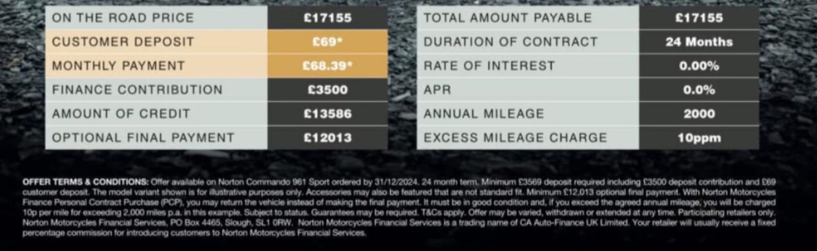 I don’t think it’s confusing… I think it’s an unbelievably good bargain !No doubt it’s confusing FE - appears to be a lease/purchase option of some sort. Excess mileage charge, beyong 2000 miles! They get their full asking price inside of 24 months unless you give the bike back; 3500 deposit? No doubt the returning of any bike would end up being more beneficial to Norton. Gotta love the fine print.