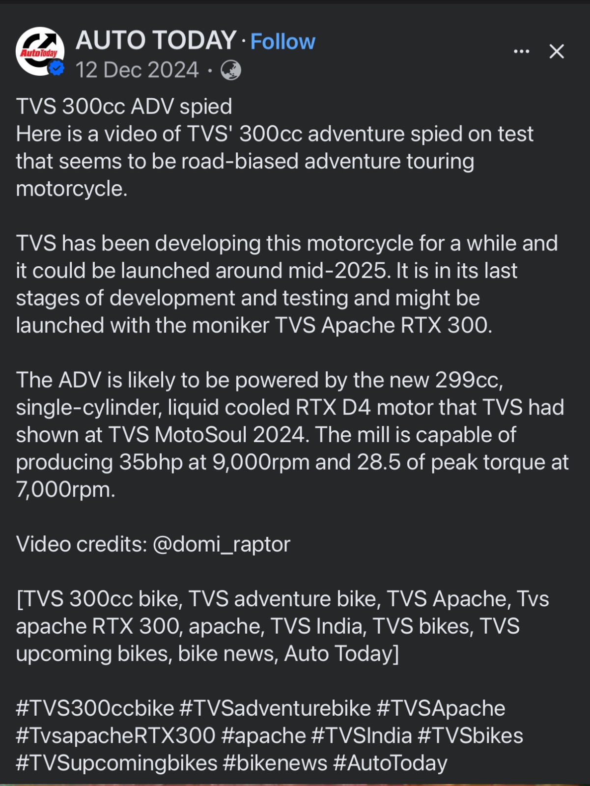 Strangely TVS Motor has been road testing a disguised 'Apache' with it's own new engine, maybe things are moving along and what better way to 'hide' the new ideas.