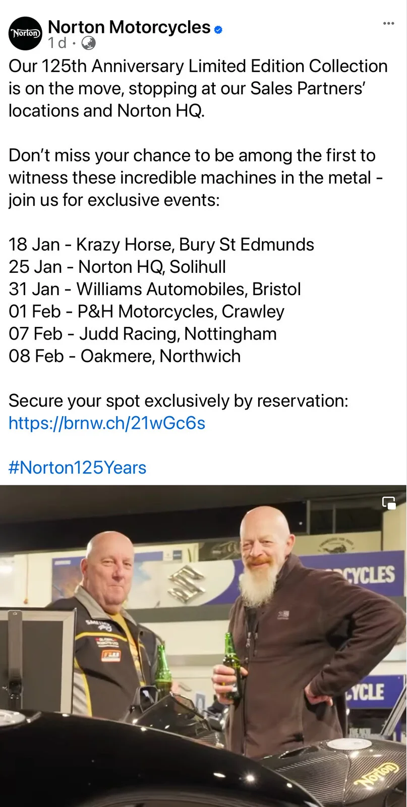 A very good motorcycling friend of mine for the last sixty years popped round on Sunday and we got chatting as you do------about bikes, and I just happened to mention about the new 961 in the garage . He was always interested in my old Sport but when he saw 'Black Bess' he started to spit feathers. He stood there looking over it for what seemed ages then sat on and started her up and started to grin. Well to cut a long story sideways I have never seen Derek so enthusiastic since he bought his v4 Panigalli . Bugger me he rings up tonight and asks if I have been invited to the open night at the dealers I bought the bike from , it seems they have forgotten to send out my invite probably just a clerical oversight , or is it because I have just spent my money and they are not really interested now my bank account has dwindled some what ( am I being a little cynical here) . Whatever I will be ringing Simon on the morrow to see if they don't mind too much if I turn up to ask some silly questions to the Norton man.