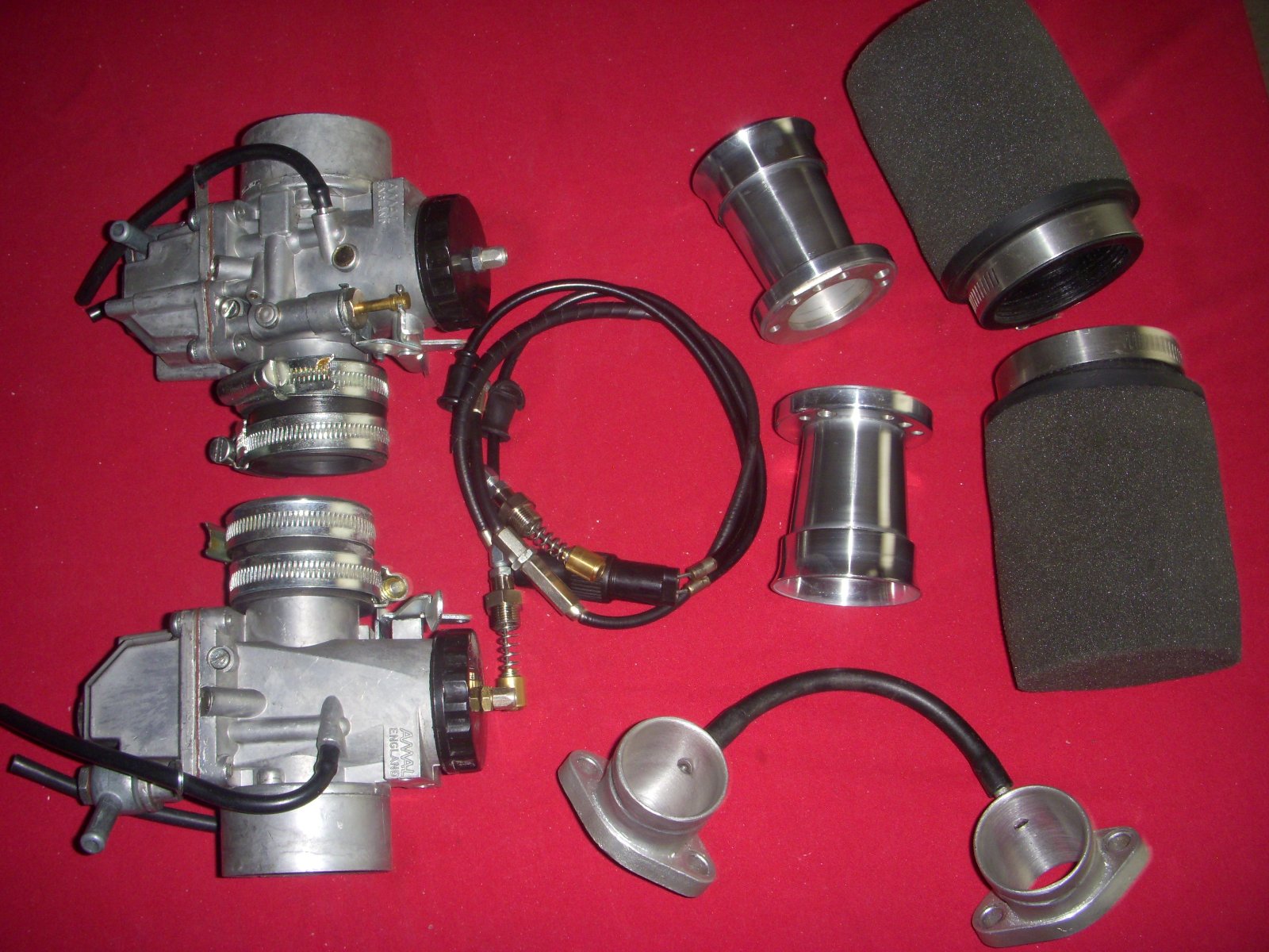 THIS IS A NEW KIT. COMES 2 34 MM CARBS R /L... 2 MATCHING MANIFLOWS, 2 STACKS AND 2 AIR FILTERS, PLUS CABLE OPERATED CHOKE KITS . FREE SHIPPING IN STATES
