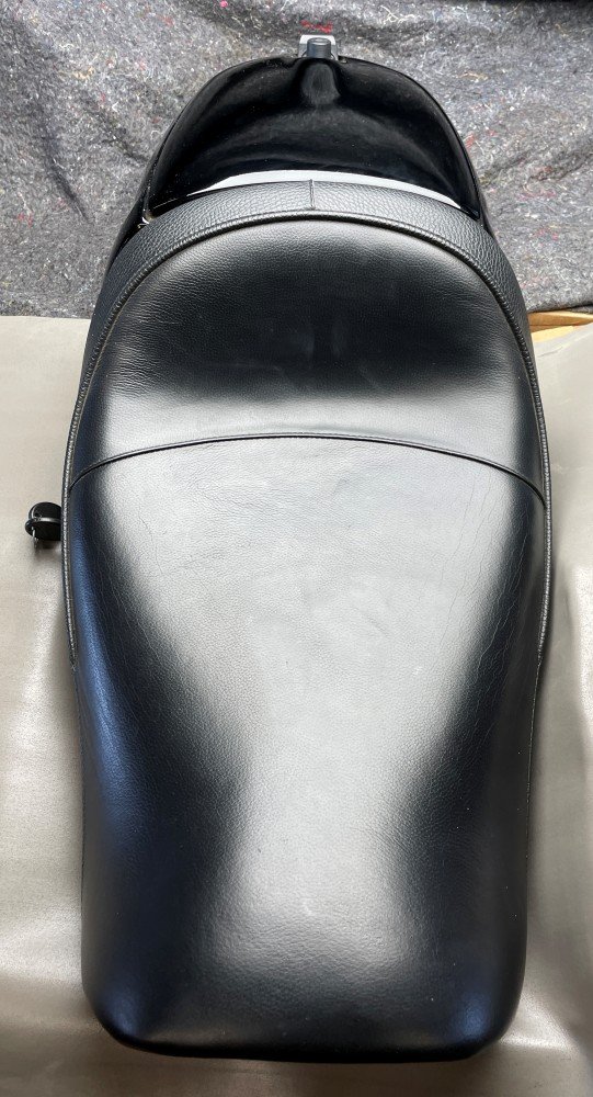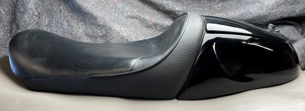 This is a LIKE-NEW Corbin Smuggler seat with locking base & storage compartment. Black paint on the compartment, black leather upholstery, inside compartment gray "carpet". Comes with 2 keys (locking base and locking storage compartment).