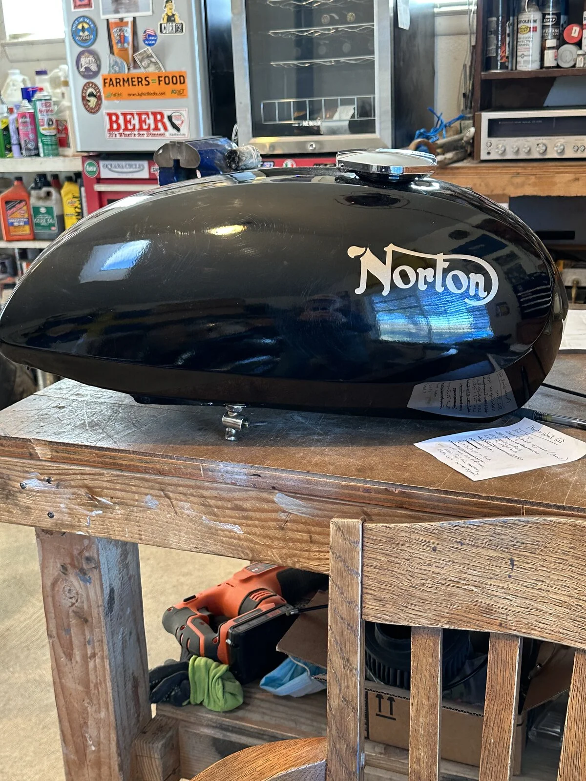 Paint shop say they can’t get pin tape to lay flat where it should sweep around and back at the front of the tank. They’ve got the color on, so I said just apply the Norton transfers I gave them, sourced from Classic Transfers in UK by me after recommendations here, thanks, and clear coat it. Maybe pins will come later.