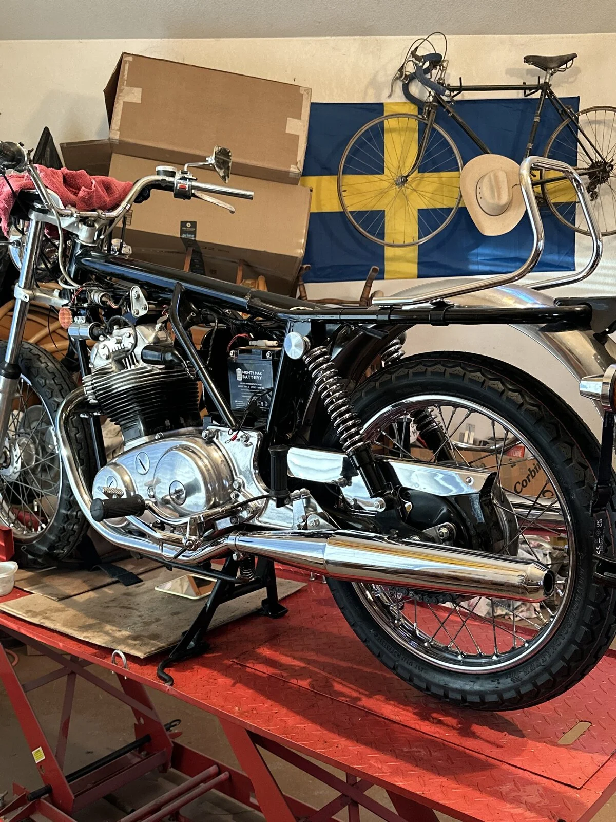 My recently acquired ‘74 Interstate had been in storage for over 20 years. Tank paint had been damaged by leaky master cylinder and the previous owner (flipper) had it and the side covers repainted but not pin striped. I intend to have that done and all clear coated. I think I’ve looked at hundreds of pictures of Interstate pin striping, finding innumerable variations of how many, how thick and placement. It appears and I have read that there were 2 stripes of 1/8” with a 1/8” space between. It also appears that placement follows just inside of the natural pressed crease on each side. Can someone confirm this and perhaps provide a photo with enough detail to aid my painter?