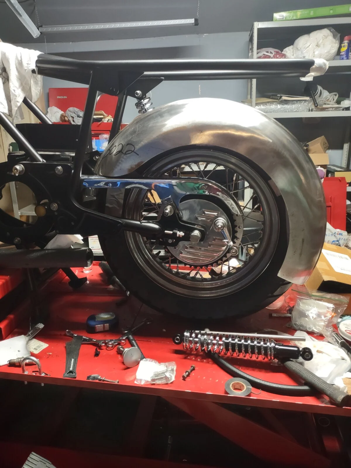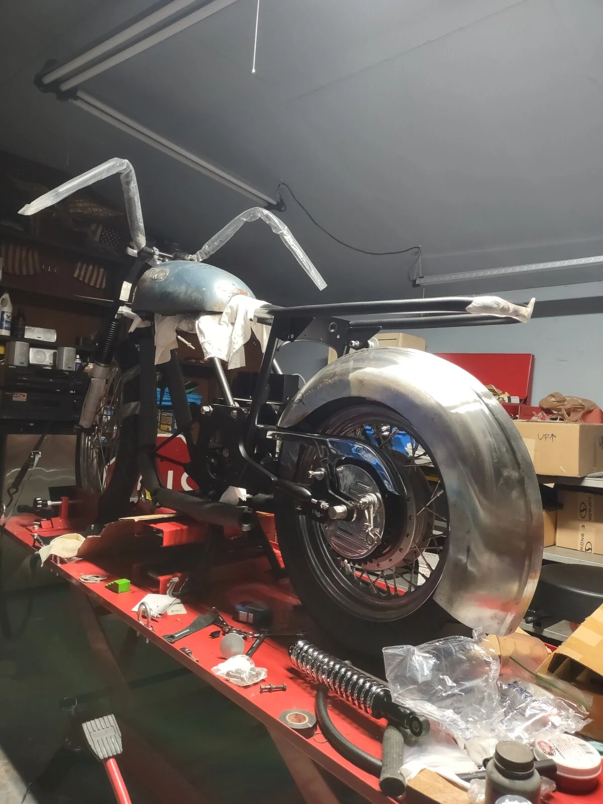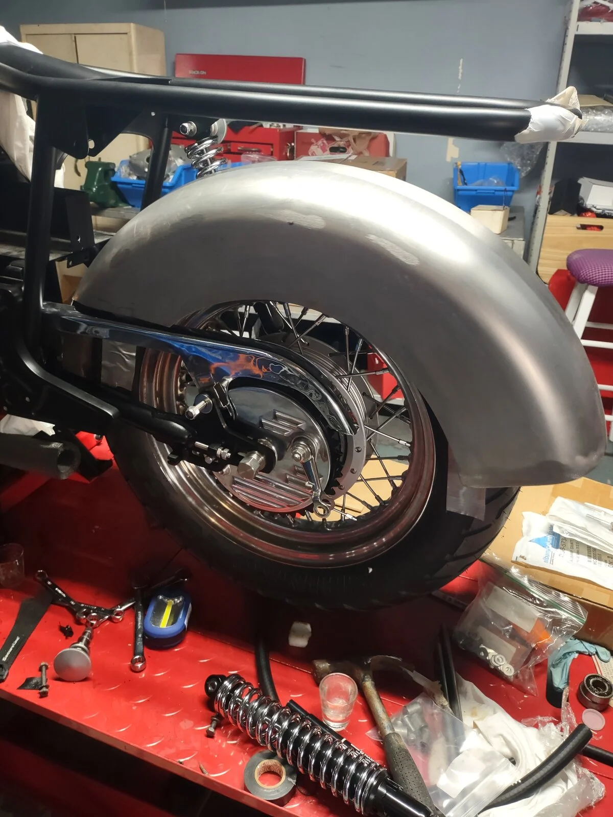 Started to fit some sheet metal for the rear swingarm mounted fender. I might as well get that done so I can build the motor while it's out for paint.
