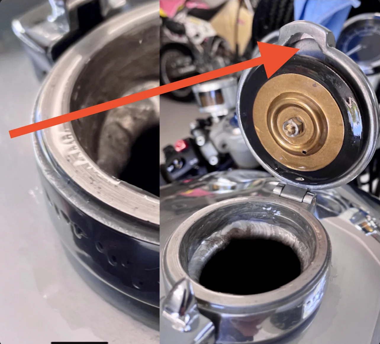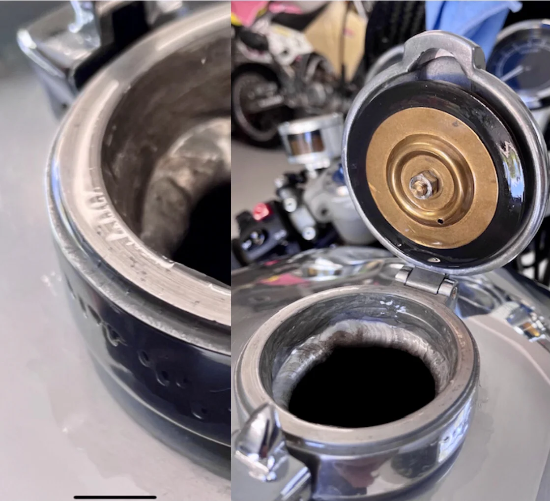 I can create a leak through the weld, by surging the fuel (moving the bike sideways) and then blow fuel down the outside of the tank from the inside of the filler neck, using a puffer bottle! So there’s definitely a hole or holes in the Ring-Cap to tank weld. Unfortunate but no big deal!