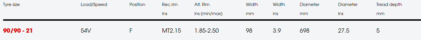 So, their 90/90-19 is really a 99/90-19 (3.9" wide)? Then they say the width is 3.9" which agrees with 99mm. So the 90/90-19 is 99 wide or 3.9" wide and the 3.25-19 is 98 or 3.9" wide. Funny that they are wider than a 3.5-10 and almost as wide as 4.00-199
